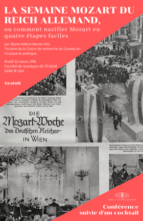Ce projet de recherche poursuit deux objectifs étroitement reliés. Il s’agit, d’une part, de mettre en lumière les récupérations politiques variables – et parfois même diamétralement opposées – dont peut faire l’objet un même répertoire musical en fonction d’un contexte socio-politique changeant, par le biais d’une étude de cas visant à montrer comment l’image et la musique des grands compositeurs du canon musical savant (Bach, Mozart, Beethoven, Brahms, Liszt, Wagner, etc.) ont été récupérées à des fins politiques pendant le Troisième Reich et les années qui ont suivi la Deuxième Guerre mondiale. D’autre part et dans une optique plus large, ce projet vise à (re)penser la distinction entre propagande musicale et diplomatie musicale, deux catégories qui sont généralement utilisées sans définition claire, et parfois même de façon interchangeable.